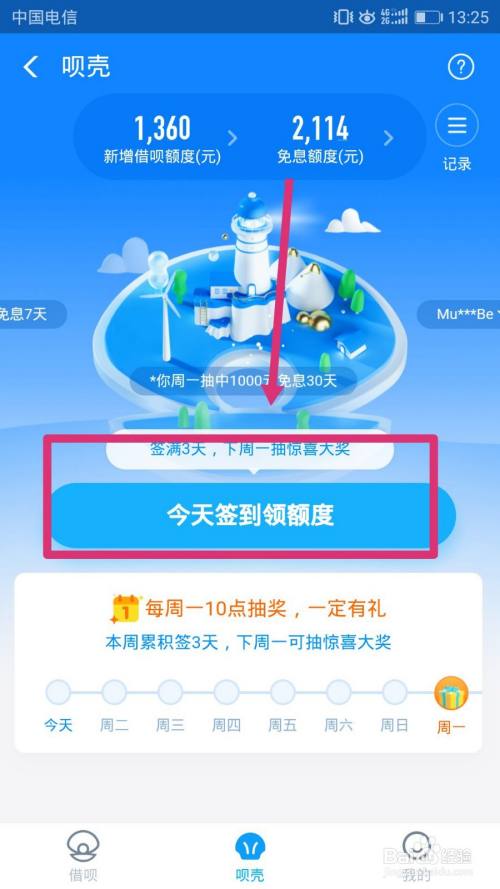 点击借呗里的“呗壳”,点击“今天签到领额度”,这个领取的额度虽然不多,但是每天都可以签到领额度。