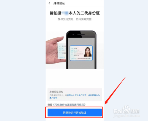 接下来系统会提示:为确保账号安全,需要使用本人证件进行验证,并刷脸确认为本人操作。请仔细阅读“可信身份验证服务通用规则”后,再点击页面下方的“同意协议并开始验证”按钮;
