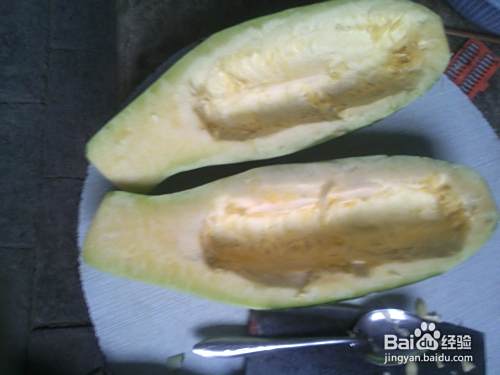 第二步就是把北瓜切开相互平等的两半,并把里边的瓤挖干净,就可以了。