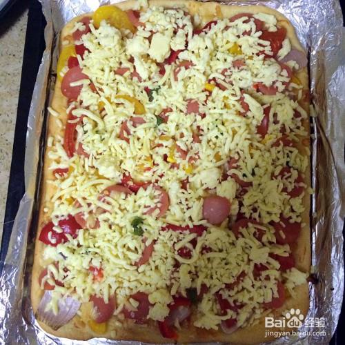 依次放上食材,洋葱,青椒,西红柿,火腿。