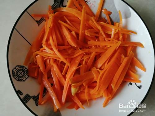 热锅下油,放蒜米进去爆香,然后下红萝卜丝进去,加适量的盐爆炒至软,铲上碟中。