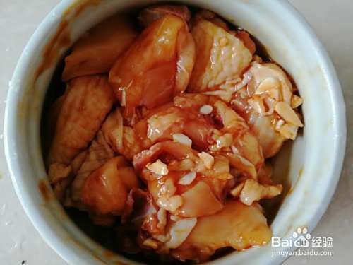 先把鸡肉斩成小块,放到碗中,加适量的盐、姜蓉、蒜蓉、生抽、料酒、蚝油、胡椒粉搅拌均匀腌制20分钟左右。