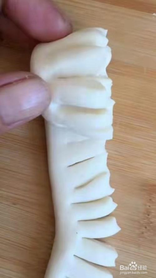 再用一块面团揉成扁长条。然后如下图用刀均匀的切开。见下图