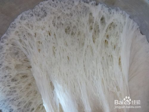 当面团发至2至2.5倍大,拉开面团组织呈细密蜂窝状即可。