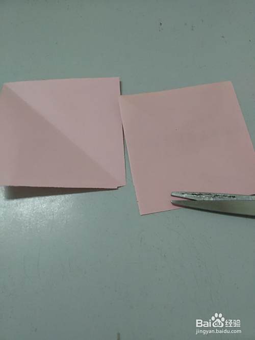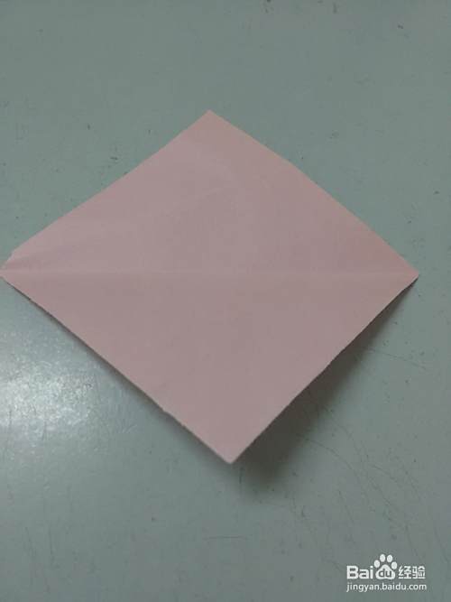 再把第二张正方形彩纸对折一下,再打开,中间折出一条对角线。