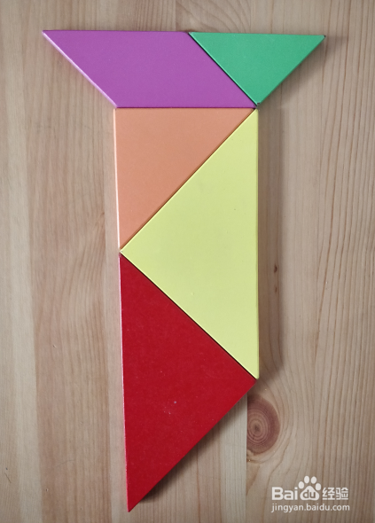 将黄色三角形斜边竖直居于右侧,放在红色三角形的上面挨着。组成一个平行四边形。