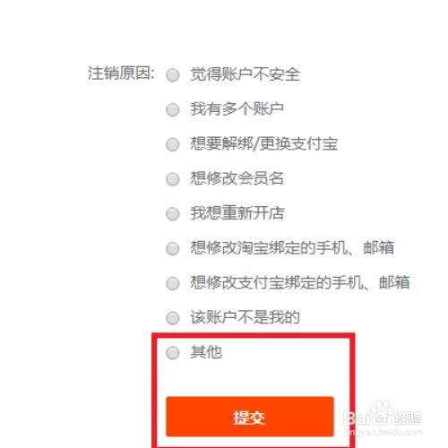 接下来,在打开的淘宝账号注销页面中,勾选底部“其他”选项,并点击“提交”按钮。