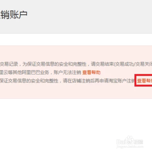 接下来,会显示账户注销失败的信息提示,先不要急,找到关于“账号开过淘宝店铺”的信息提示,直接点击“查看帮助”按钮。