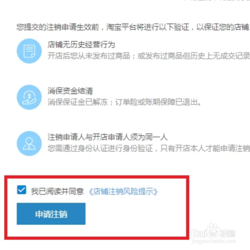 接下来,将弹出“淘宝店铺注销”页面,在该页面中直接勾选“同意协议”按钮,并点击底部“申请注销”菜单。