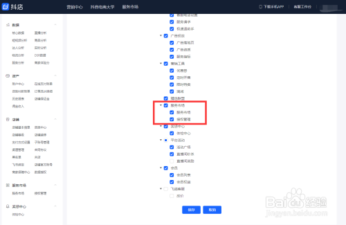 下来选择服务市场分类,同时勾选【服务市场】和【授权管理】,点击【保存】。