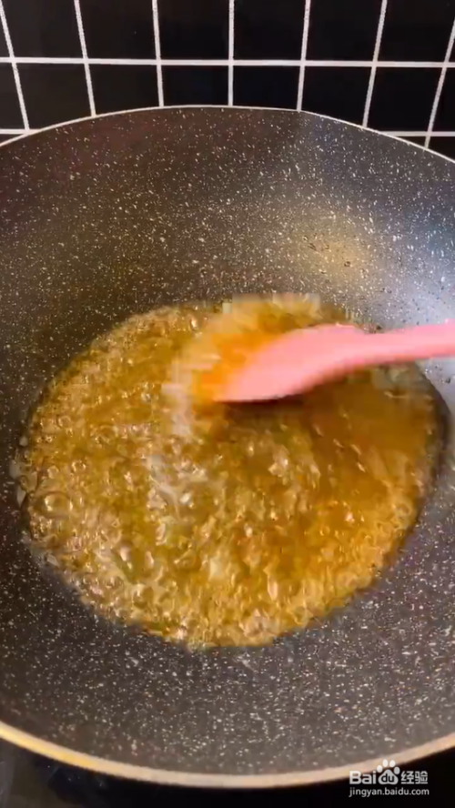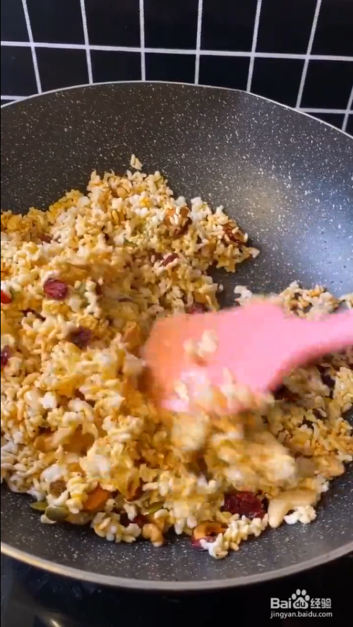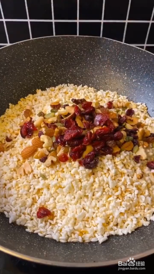 锅里放一勺糖,一勺清水熬至香油色,倒入炸好的大米、坚果、葡萄干、蔓越莓干,快速翻拌均匀。