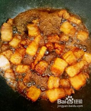 锅底留油放冰糖,搅拌至冰糖融化,放入五花肉。