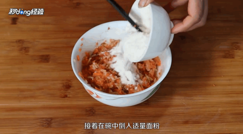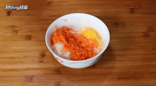 4将白萝卜碎和胡萝卜碎倒入碗中。