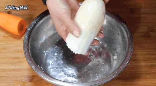 1首先将准备好的白萝下和胡萝卜分别去皮。