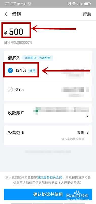 输入“借钱金额”,选择“借多久”,一般有6个月和12个月的借钱期限的选项;
