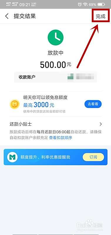 点击“完成”,等待放款,一般3分钟之内到账。