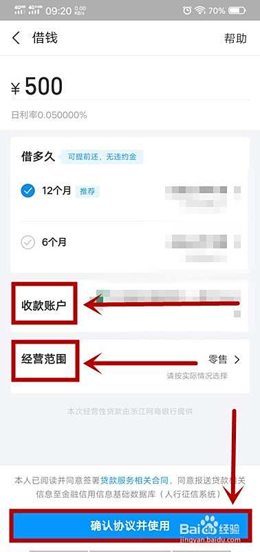 5.选择“收款账户”,选择“经营范围”,再点击页面下方的“确认协议并使用”;