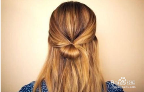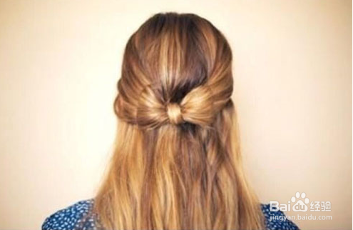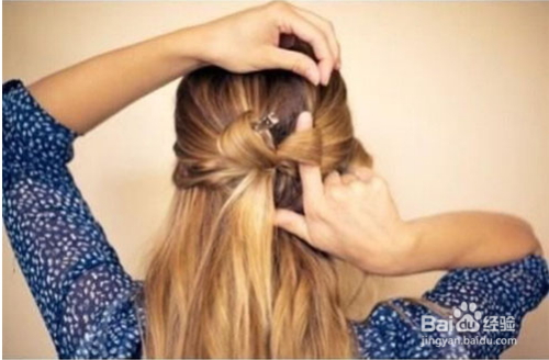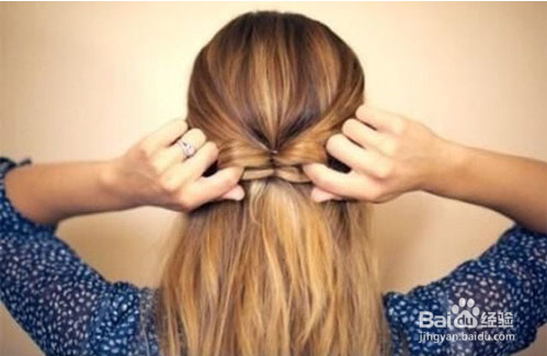 将两股发束拢到脑后,用橡皮筋系好,发根不完全拉出来,留着做蝴蝶结造型。