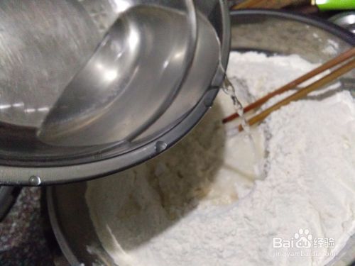 把温水倒入混合好的面粉中和面,边倒入边搅拌。