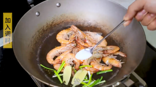 加入焯好水的大虾,加入花椒、葱、姜、盐、鸡精。