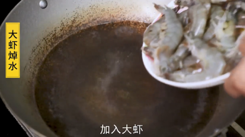 水烧开,锅内加入大虾,滴入料酒,去除腥味。