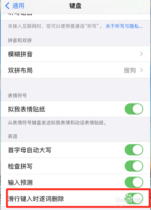 第四步:找到滑行键入时逐词删除,打开后方的开关即可。