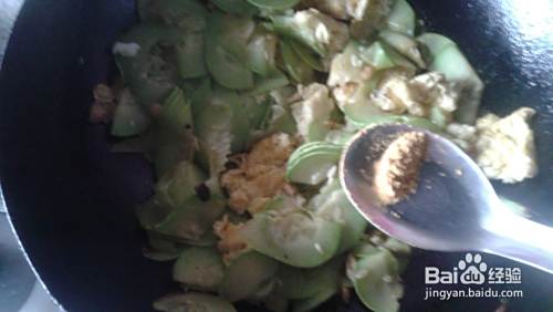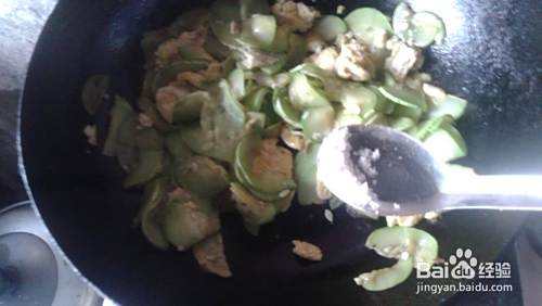 放入盐、十三香、鸡精,将调料与黄瓜鸡蛋炒均匀。即可关火,盛成装盘食用。