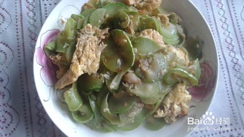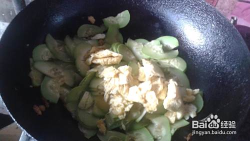 当黄瓜炒至略微变软时,放入鸡蛋块翻炒。鸡蛋不用放太早,已经是熟的放早了会老。