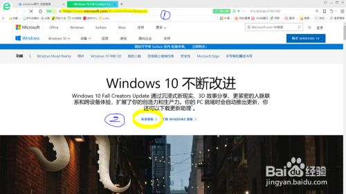 下载“易升”软件。可以通过百度搜,或者直接输入网址(标注1处的网站:https://www.microsoft.com/zh-cn/windows/features),点击标注2,弹出下载对话框;