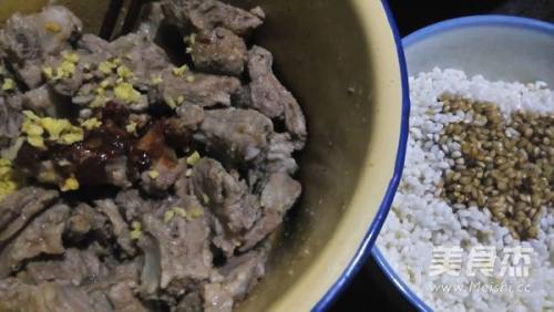 4糯米放老抽豉油,排骨放盐,姜末,料酒,糖,胡椒粉,老抽豉油,豆瓣酱拌匀腌制2小时