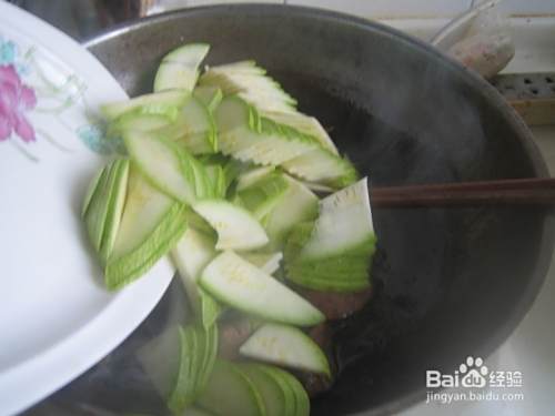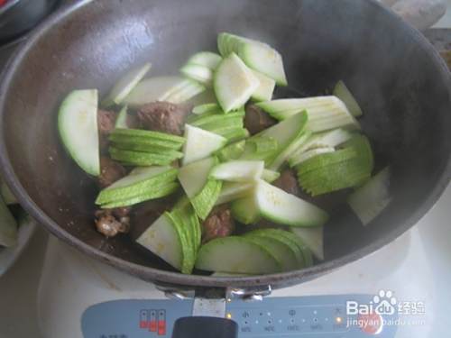 将电磁炉火调到中火后,备好的西葫芦片放入炒锅中和鸡肝一起炒。
