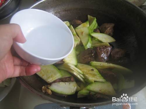 将备好的一小碗水放入鸡肝西葫芦片中,用中小火来焖。