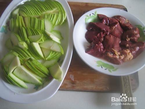 鸡肝买回来就要通过清洗后将胆汁去掉后,用刀切成块,西葫芦清洗后用刀切成片备好。