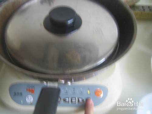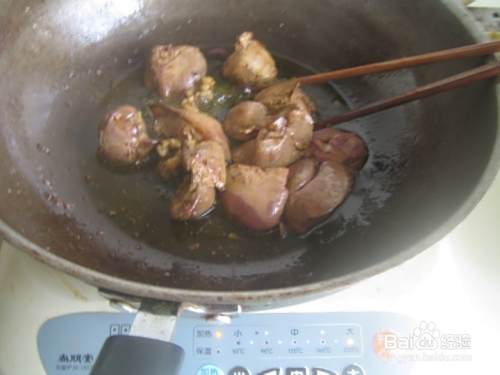 将电磁炉炒锅刷干净打开电磁炉开关后放上豆油加热,备好的鸡肝块放入炒锅中炒6分熟。