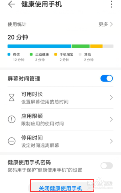 下一步,点击关闭健康使用手机。