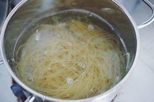 按照说明,锅中水烧开以后,放入冷面煮一分钟,捞出来