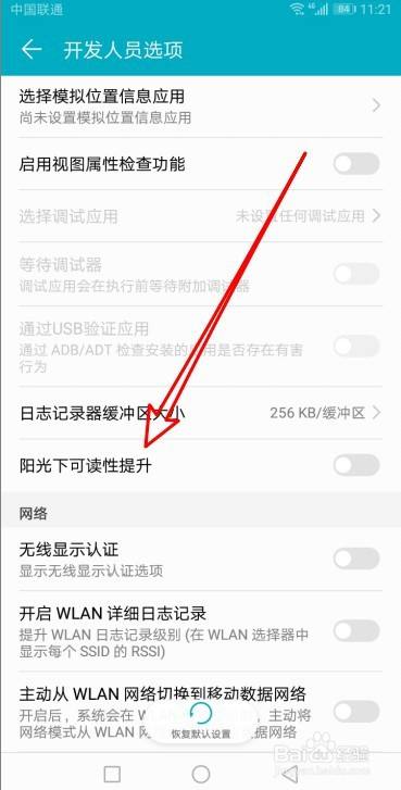 然后切换到开发人员选项窗口,找到阳光下可读性提升设置项。