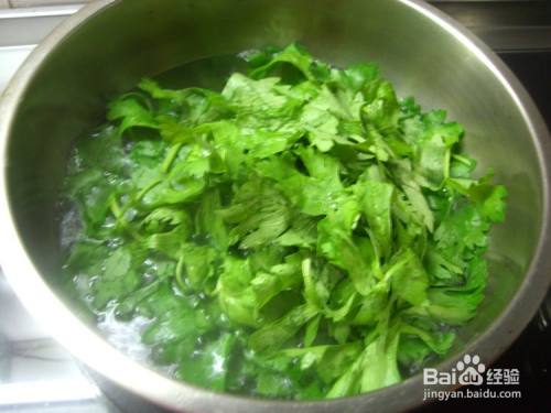 2、将芹菜叶洗干净,在开水中焯一下,捞出。