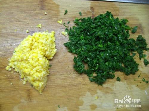 3、将芹菜叶挤干切碎,熟玉米粒也切成碎末。