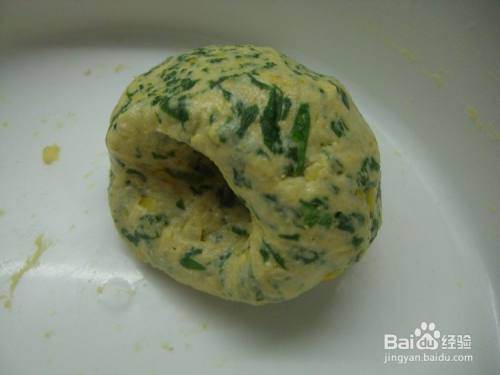 4、然后将芹菜末、玉米粒末放入玉米面和面粉中,加水和小苏打,揉成面团,醒15分钟。