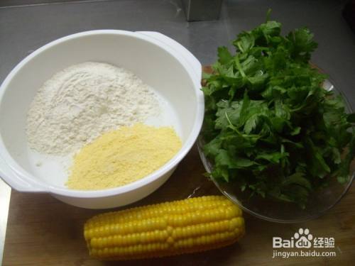 1、准备好食材:玉米面、面粉、熟玉米、芹菜叶。