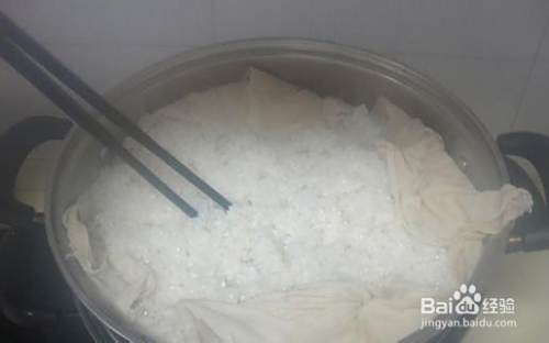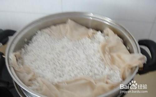 蒸格上垫上浸湿的蒸布,加入糯米盖上大火蒸20分钟