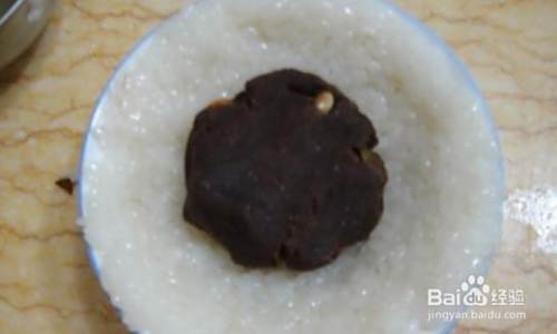 碗底先加入糯米饭,把糯米饭慢慢的往碗边上中间掏空的状态