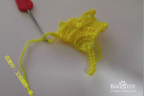 第6行:翻过来进行钩织,立一个辫子针做起立针,然后在立的针目里钩织一个短针的条纹针,再顺次钩织5个短针的条纹针,然后拉4个辫子针,在第4行2辫子针形成的洞洞里钩织一个短针,拉4个辫子针,再顺次钩织6个短针的条纹针。