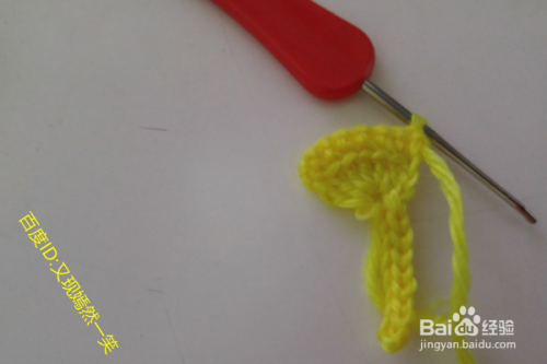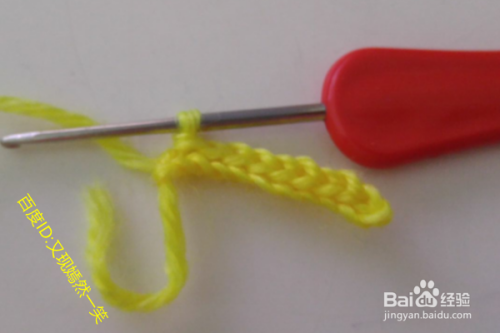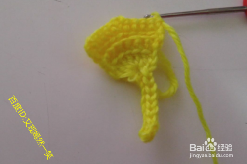 叶柄的钩织:拉10个辫子针,然后返回在倒数第2针开始顺次钩织引拔针连接,一共钩织9个。