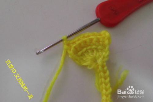 第4行:翻过来进行钩织,立一个辫子针做起立针,然后在立的针目里钩织一个短针的条纹针,再顺次钩织4个短针的条纹针,然后拉2个辫子针,再顺次钩织5个短针的条纹针。