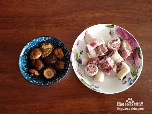 香菇用温水浸泡软化。猪尾巴清洗干净,剁成块。