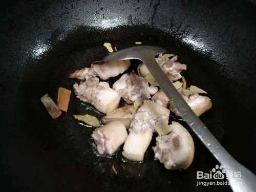 起火倒入适量食用油,热油,倒入猪尾煎炒,加几片香叶和桂皮。不想太多大料的味道,所以我加这两样而已。