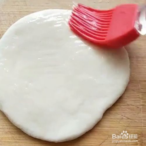 盖保鲜膜醒十分钟,揉成小记子。按扁,刷一层油,再按一个。擀平。