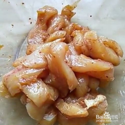 鸡胸肉切成条。加酱油,盐,鸡精,少许胡椒粉,辣椒粉,抓均匀。腌制二十分钟。